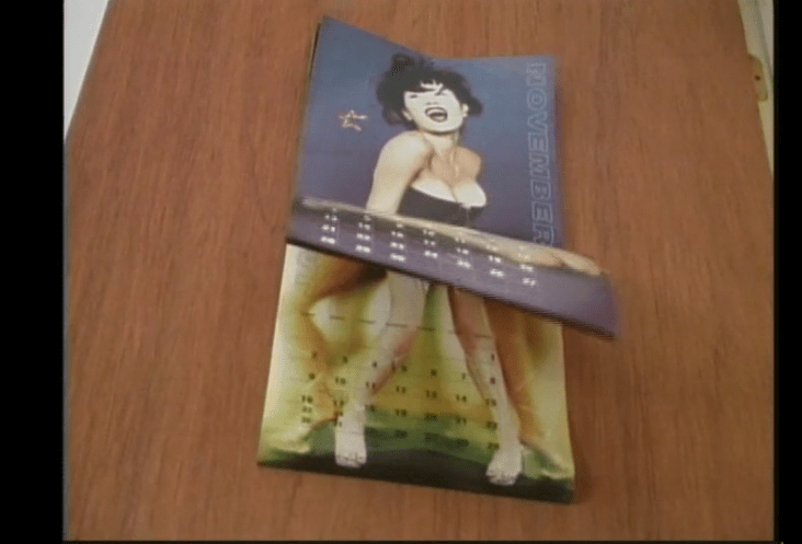 Calendar girl by Patty Chang is a short piece which shows a Calendar attached to a wooden door and getting flapped in the wind by an air purifier that props the door open.